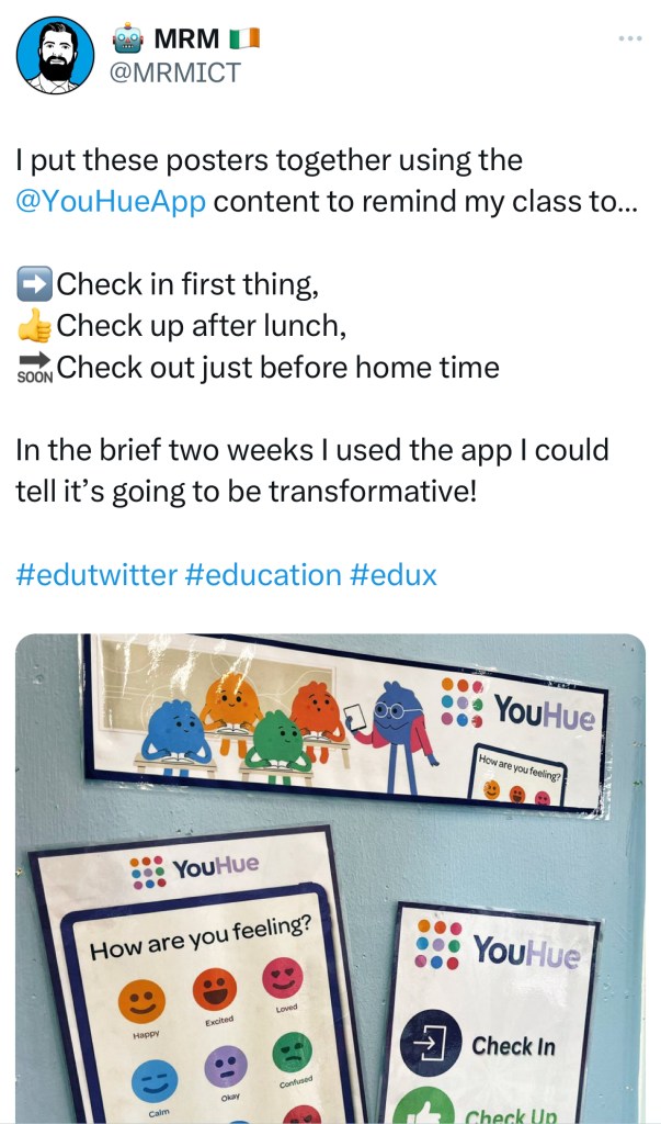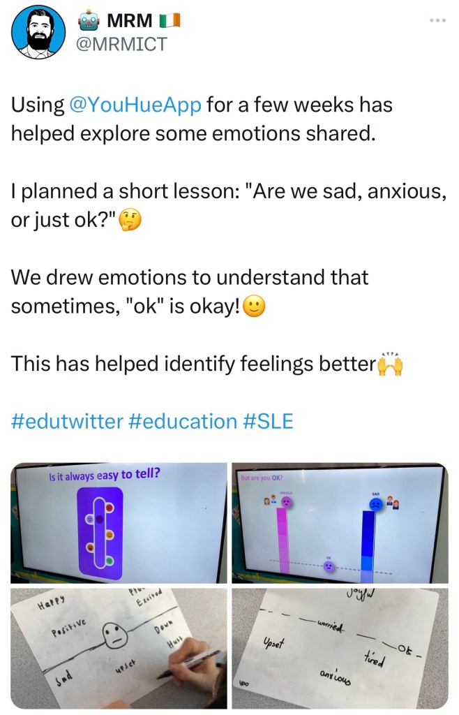 The YouHue app, has been transformational in school. I genuinely can’t see how we managed without it and I believe as it develops it has so much more to offer. Its check ins along with its incredible activities feature, offers a unique and effective way to support emotional well-being and engagement in the classroom. By incorporating these activities into your daily routine, you can create a supportive and empathetic environment where children feel understood and valued. As we reflect on the year that has passed and embark on a new academic year, tools like YouHue can play a crucial role in fostering emotional literacy and resilience among children, setting the stage for a fulfilling school day.