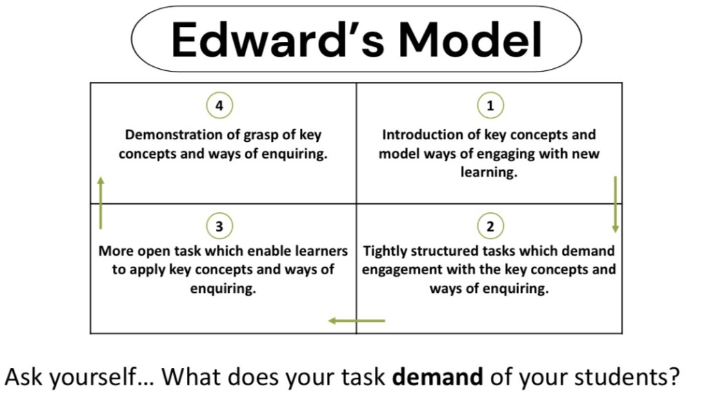 The foundation of Edward’s model starts with introducing key concepts and modelling ways of engaging with new learning. This stage involves careful consideration of pedagogical choices. Refer to part two of this blog series for an in-depth exploration: