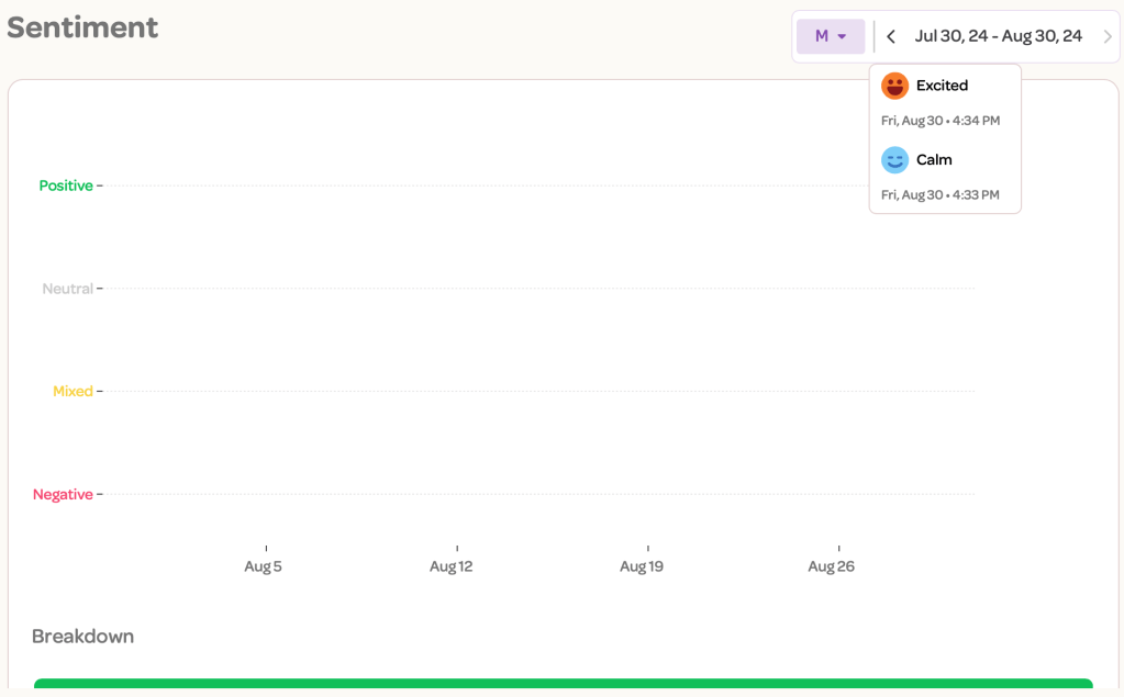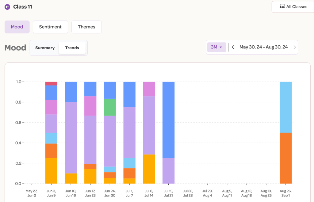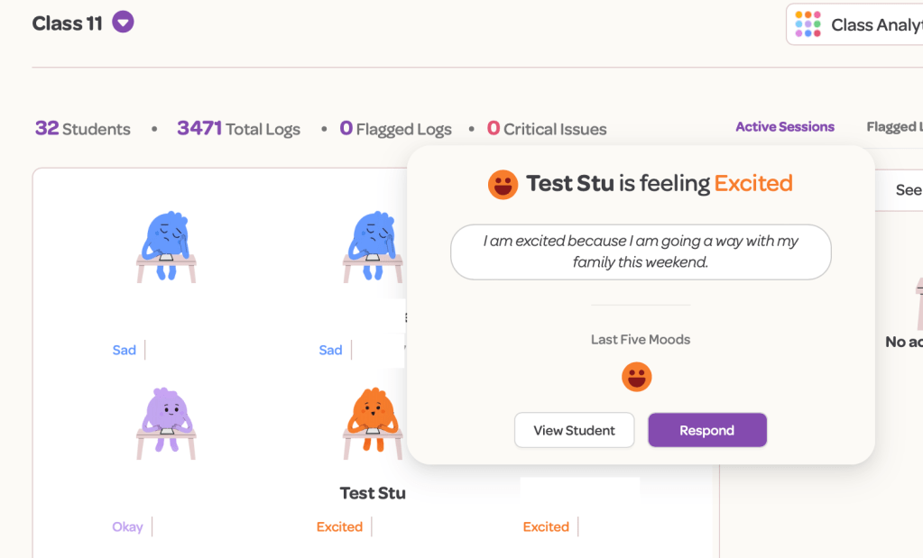The Educator Dashboard has seen significant improvements, providing an even clearer view of the emotional atmosphere in your classroom. The interface is now more streamlined and goes beyond just tracking moods; it helps you understand the factors behind those moods, enabling you to foster a more supportive learning environment. A simple yet effective new feature allows you to hover over a student to see their most recent check-in, their last five moods, respond directly from there, and view the child’s profile in greater detail.