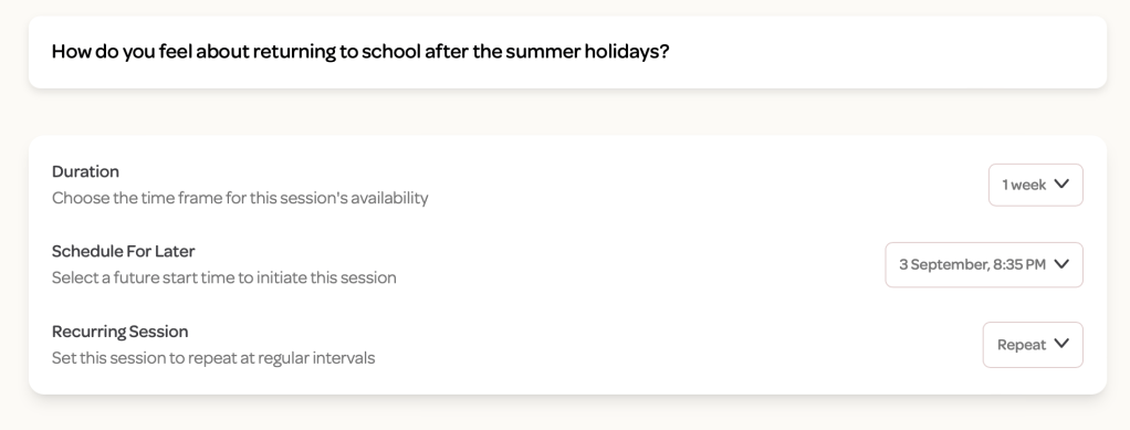 Something that will help me manage the ‘bigger questions’ in the app is the new timed questions feature. I often wanted to ask a specific question—for example, being a Year 6 teacher, I might want to ask: “How are you feeling about going on residential?” or “How are you feeling now you have done your first SATs paper?” Well, now I can. I have had a quick try at setting up a question for my class’s first day back, and it couldn’t be simpler.