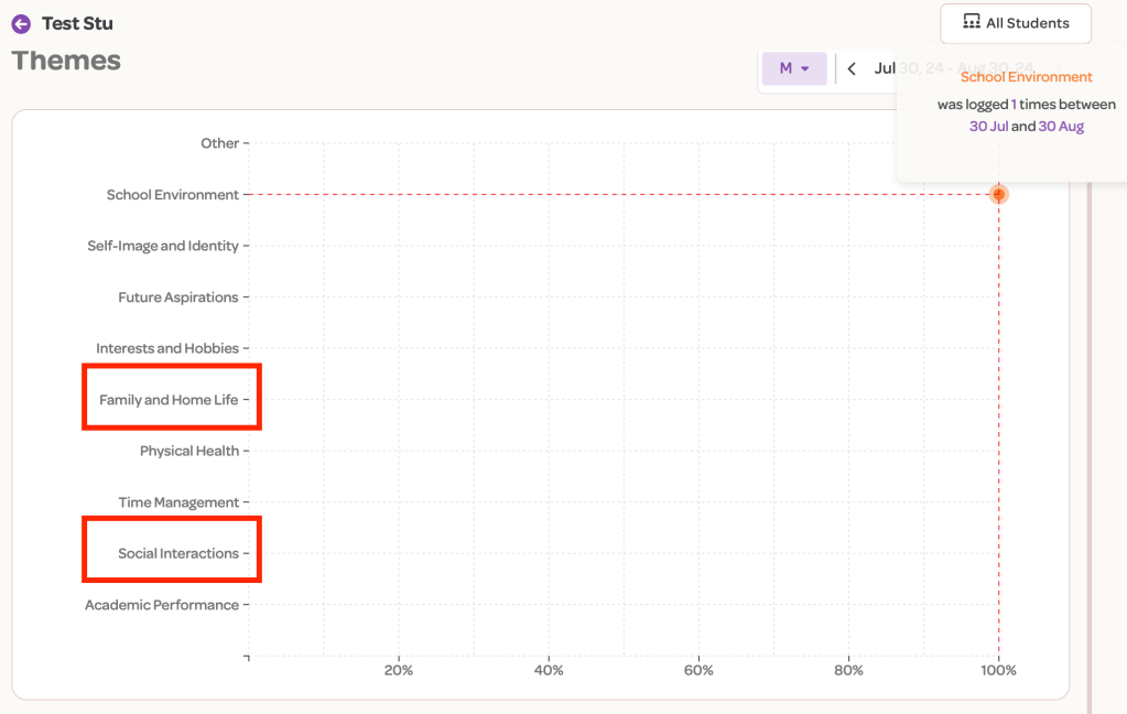This is incredibly useful for either intercepting the child as soon as they come in or for having a considered and watchful eye to ensure they receive the support they may need. Now, we have sentiments and themes. While they may sound similar, they are not. Themes allow us to determine any recurring patterns that may emerge based on how and what the children are checking in. For example, a theme emerging from a child or your class based on their posts could be related to ‘family or home life’ or ‘social interactions.’ This is another detailed way in which YouHue interprets the information, ultimately acting as an insightful emotional guide for you.