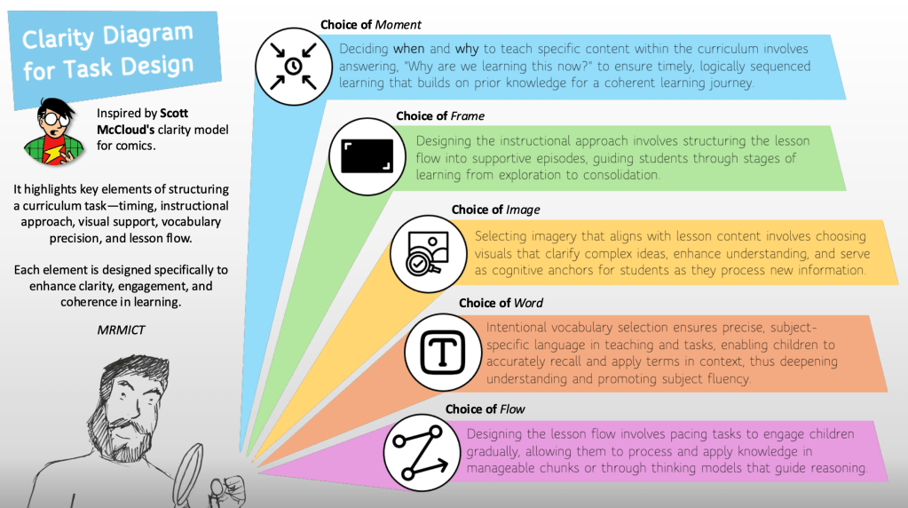 Clearly what I am saying is, like comics, task design is a visual and cognitive experience. We are not just presenting information for children to recall; we are guiding them through a journey of understanding, using deliberate and thoughtful choices of moment, frame, image, word, and flow. McCloud’s work has reaffirmed for me that task design—like creating comics—is about much more than just assembling parts. It’s about intentionality and clarity in communicating complex ideas in ways that children can engage with deeply.